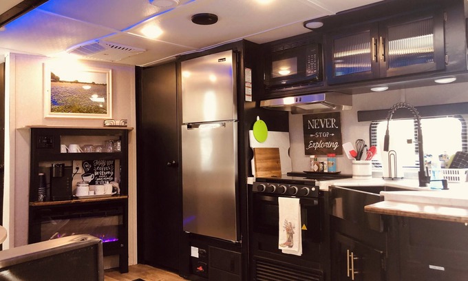Enjoy a family Glamping Experience the easy way in this comfy Glamper in the "back 40" of the property in Dripping Springs. Step into a great kitchen, with a FIREPLACE, dining space, and comfy couch. Kitchen is well-equipped for everything you need to cook or grill, and the Coffee Bar is stocked (Good morning!) There's a Queen bedroom at one end of the caravan, and the twin bunks are up front, with full bath with shower in the middle. Outside, you'll love your own deck with seating, and the common outdoor spaces with Firepit Table (great for S'mores!), picnic table, grill, and big open skies! Wanna play games? Visit our Amenities Room for indoor and outdoor games for adults and kids alike. With a tranquil atmosphere for a relaxing stay, this caravan is the perfect retreat for your getaway. We're minutes from Dreamland, Salt Lick, Pedernales Falls state Park, Reimer's Ranch, Blanco State Park, Field of Dreams, and all the events in this charming town of Dripping Springs.