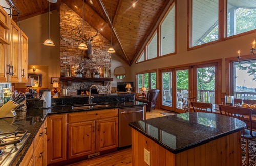 The main level consists of the spacious living room with a massive 20-foot stone gas-log fireplace adorned with a 600-year-old antique mantle and buffalo head above, satellite TV with DVD, DVR and VCR and built in custom surround sound system, a spectacular gourmet kitchen, breakfast nook, dining Room, 3 spacious master suites, each with a king bed; one with a twin trundle underneath. Each bedroom has its own private bathroom and satellite TV. There is also a steam room and jacuzzi, and a large furnished, covered upper deck with a large gas grill.