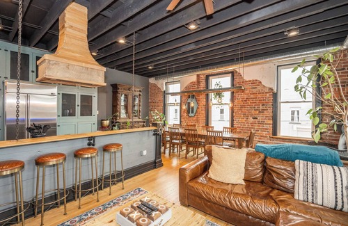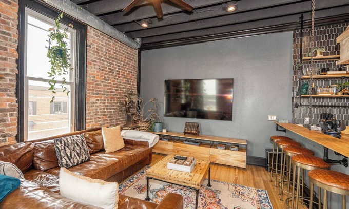 From the moment you step inside, you’re welcome by the character-rich blend of vintage charm and modern design. The open-concept layout unfolds into a cozy living room, where a spacious sectional invites you to sink in with a good book or a board game from the collection, while the smart TV sets the stage for a movie night. Flowing seamlessly into the kitchen, you'll find an industrial-chic space with light blue cabinets, stainless steel appliances, and a Keurig ready for your morning brew. Pull up a stool at the counter seating for four and watch the action unfold, or gather around the dining table—perfect for dinner parties or casual breakfasts before a day of exploring.