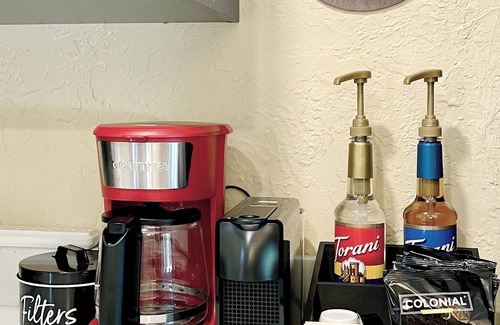 • Drip coffee maker and electric tea kettle (teas and ground coffee provided)