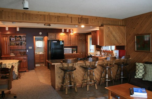 THE MAIN BUNGALOW COTTAGE: Sleeps up to 5 with two on a queen size bed on the lake side, and three on a full/single bunk bed in the back room. It has two bathrooms with a shower in one and a washer/dryer in the other. The kitchen has been recently upgraded. It also has a 48-inch TV with Charter Cable and all channels, plus a landline phone for free calling within the U.S.