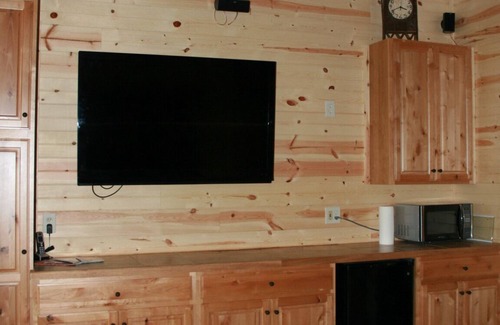 THE BUNKHOUSE: Sleeps up to 8 persons with 2 on a queen size bed on the loft, 4 on single bunks on the ground floor, and 2 on a full size pullout sofa. Please note that the max number of persons allowed sleeping on the property is 13. It has one bathroom (no shower) on the ground floor. We have also added a private deck shower that I personally use every time I shower at the property! (Check our reviews - everyone seems to love the deck shower). It has a 60-inch TV with Charter Cable and all channels and surround sound.