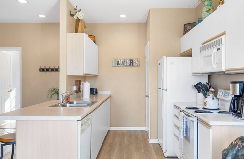 As you step inside the home you’ll be immediately drawn into the open, brightly lit spaces accented by calming neutral tones in the wall color, furnishings, and décor. Brand new flooring runs throughout each room creating synergy and providing a clean, fresh environment you can fully relax and unwind in. Enjoy quiet downtime in the living room to catch up on your reading or surf the channels, comfortably seated on the sofa or in the armchairs. When you’re ready to turn up the fun, host a family game night here or steps away at the dining room table with seating for 4. In the cooler months, the electric fireplace will fill the room with warmth and ambiance, an ideal environment for watching movies. The kitchen is well-equipped and capable of accommodating all your culinary aspirations, with ample counter space for meal preparation or displaying a spread of afternoon hors d’oeuvres.