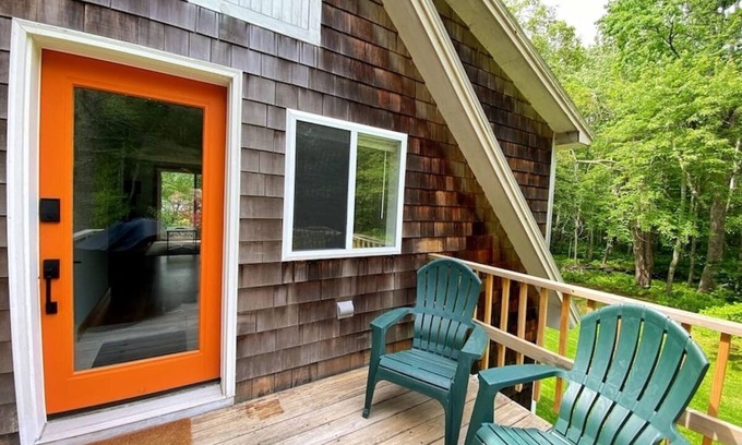 Salisbury Bunkhouse is a two-bedroom home located above a garage across the lane from the lake. When you arrive, you'll park outside and walk around the right side of the structure, where you will find a set of stairs leading up to a deck and the front door. Let yourself in with a personalized code (provided to you once you book).