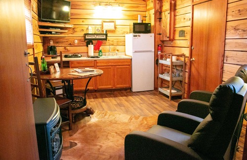 This private cabin is perfect for those honeymoons, anniversaries and romantic couple getaways. It is set off by itself for maximum privacy. It has a nice kitchenette / den combo and a separate bedroom with King bed. Includes a two person corner Jacuzzi in the adjoining bathroom and a gas log western stove. The walls are pecan and cedar cut from trees here at the ranch. There is a private patio off the back with a nice view overlooking the horse meadow. 450 sq ft | Sleeps 2