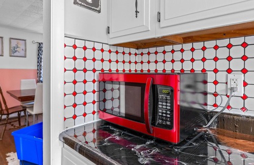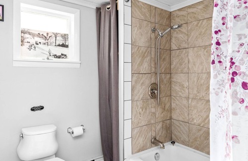 Straight ahead off the entry room is a large bathroom on the right before the hall. Two bedrooms, one off either left or right of the hall. The larger honey themed room has a partially valted ceiling and showcases some of the old woodwork of the era. The red bedroom has a lower ceiling but provides for a nice snug sleep for anyone that needs..