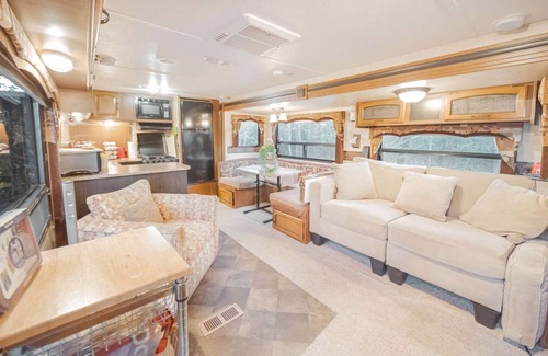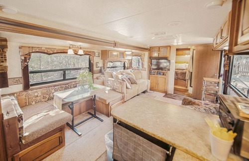 Enjoy the lovely setting of this romantic spot in nature. This one of a kind spacious RV has everything imaginable to enjoy some much needed time away. This RV has 1 bedroom and 1 bathroom, fully stocked kitchen and a roomy living room. Next to it you will find a beautiful glass room, furnished with a TV, full size sofa bed, and a fridge. For those that love the outdoors, spend time on the outdoor patio with outdoor furniture and a grill to enjoy your weekend. Book this cozy home today.