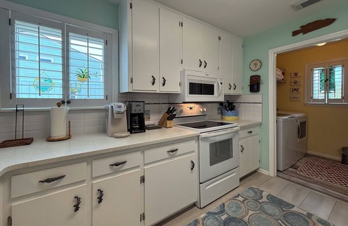 • Fully stocked for cooking: blenders, crock pot, upscale Cuisinart pots/pans, Cuisinart coffee maker, Keurig, and more.