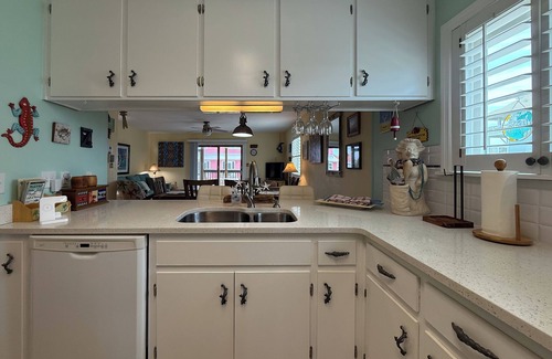 • Living area: Plantation shutters, new memory-foam Queen sofa bed, and oversized twin chair/sleeper for additional guests.