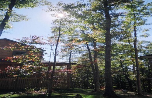 Modern, light, 4 bedroom and 2 1/2 bath log cabin on 3 levels. Enter via a walk-way from parking area (space for 3 or more cars) into the dinning/kitchen area. Sliding glass doors lead out to wrap around deck, with tranquil views over woods. Upstairs are three bedrooms with queen sized master bedroom and en suite. The three remaining twin bedrooms share a second upstairs bathroom. Downstairs is a basement bedroom with two twin beds. Outside at the back of the house is a picnic area, BBQ and fire pit, secluded at the edge of the forest. Cabin includes gas wood burning stove, wifi, cable tv, dvd player and washer and dryer units.