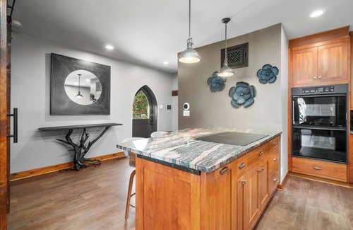 First floor: The front door opens into the living and dining area. The kitchen features a large countertop with eat-in barstools. A drip coffee maker, grinder, and whole coffee beans are provided. The half bath and laundry facilities are here on the first floor. Recently added is a king-size sleeper sofa, so the home can accommodate up to 6 guests. For guests sleeping in the living room, please be aware that the triangular windows do not have blinds or curtains. If you plan to use this, please let us know in advance so we can set out extra bedding.
