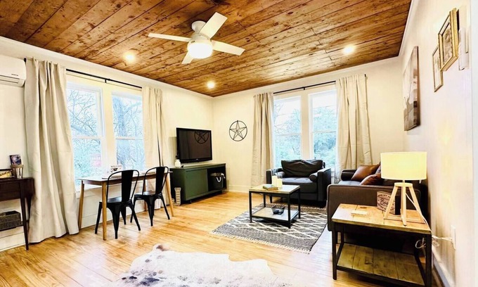 Fully renovated 1935 Carriage House. This is a2nd floor unit (13 stairs)with an off street, dedicated parking spot. Full kitchen including Keurig and coffee, full bathroom featuring aclaw foot tub, this space hasall the amenities you will needfor a comfortable stay. Fast wifi and Roku TVs, work and dining space.Located in the heart of downtown Gladewater, you can walk to dining, shopping, and our many antique stores here in the Antique capital of East Texas. Fits 2 adults + 1-2 small kids