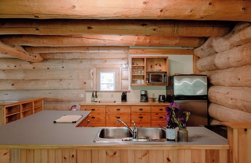 Inside, this charming log home boasts a full kitchen and a cozy open-concept living room with a large propane fireplace.