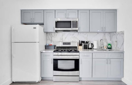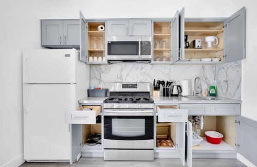 Stove | Oven | Refrigerator | Microwave | Toaster | Water Kettle | Coffee maker | Brita Water Filter | Cooking utensils | Silverware | Oven mitts | Plates and bowls | Mugs, cups, wine glasses | Dining table | Split A/C