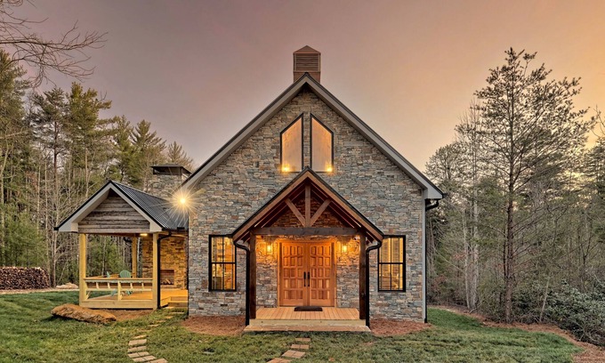 Amazing brand-new cottage fashioned after an 18th century church nestled alongside Panther Creek Recreational Trail. The “Chapel” features a stone facade with attached outdoor cooking pavilion and masonry fireplace with private outdoor shower. The home offers serene views and the perfect setting for outdoor entertainment. It boasts a full kitchen, soaring chandelier lit ceilings, and living room flanked by two story stone fireplace. Comfortably sleeps 6 with a queen master suite on the main level, queen loft bedroom with full bath, and living room featuring a convertible sofa-bed. Located close to dream destinations including Clayton, Clarkesville, Tallulah Falls, and Helen, GA. And just a short drive to Blueridge, Blairsville, and Hiawasee, GA as well as Highlands and Asheville, NC. Hiking trails, waterfalls, boating, fishing, zip-lining, tubing, horseback riding, award winning restaurants, shopping and much more are nearby. Wedding venues including Glen Ella Springs and Lake Rabun Hotel are only a few miles away.