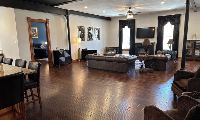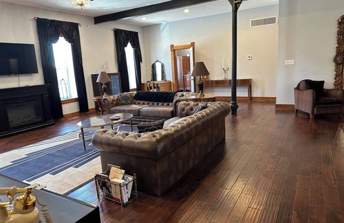 Very large private upstairs suite located in the historic town square near restaurants, events, and night life. Sleeps 8-10 people in three bedrooms. The bathroom features a soaking tub and a separate shower with a double vanity. The suite also boasts a full dining room, large island, and fully loaded kitchen for entertaining large groups if you desire.