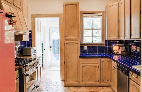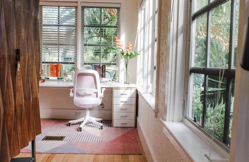 "Tropic like it's hot" at Blue Pineapple, a recently renovated 3-bed, 3-bathroom house in the heart of Historic Old Northwood District. The two-story home comes with a fully equipped kitchen (and pink refrigerator), 'Work From Home' laptop and office space, and on-site parking. This historic vacation home has high ceilings, Miami-Dade pine wood floors and tasteful artwork throughout. Highlights include: