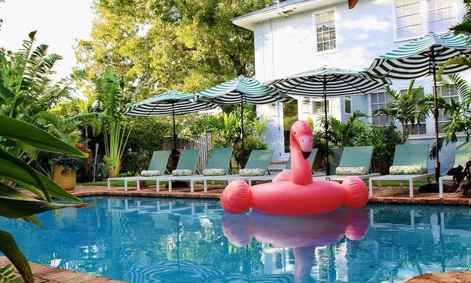 The carefully curated decor is inspired by the sophistication of Palm Beach, playful colors of South Florida, and retro feels from "Old Florida". Work from home using our laptop friendly workspace inside the cottage, or from the large saltwater pool since Wi-Fi is located throughout the property. This vacation rental estate is the perfect place to live out your 1950s-postcard dreams. Relax and unwind among the lush, overgrown tropical garden or roast s'mores by the outdoor fire pit. The recently renovated, historic property features all you need for a perfect getaway and is close to beaches, shops, restaurants, golf courses and Palm Beach Island.