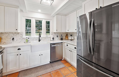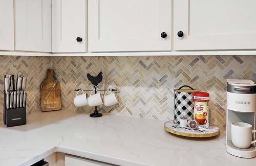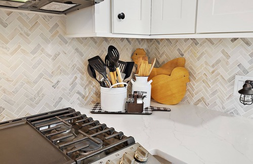 The recently renovated kitchen is fully equipped featuring a gas stove, microwave, toaster, dishwasher, Keurig, spices, and plenty of kitchenware to make cooking a breeze.