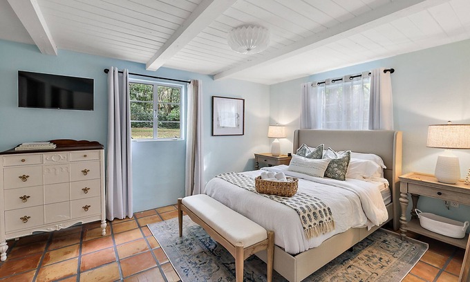 As you enter the home, you will immediately take notice of the the soft colors and French country inspired furnishings. The Clara is set up to provide its guests with a boutique stay experience! The primary bedroom offers a 32" smart TV and a large double closet. Plenty of natural light can be found here. As you wind down for bed, the blackout curtains and premium bedding in both rooms makes for a restful night in.