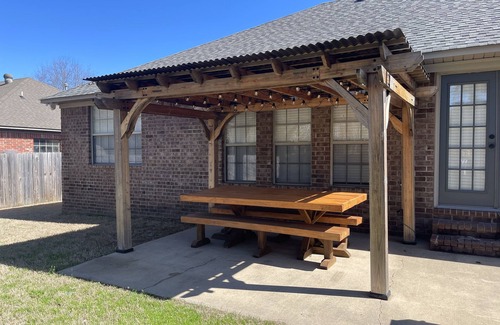 This stylish home sleeps 12 with 3 king size beds and 4 twin size beds & 2 full size futons. There are smart TVs in every bedroom. It offers a large, fenced yard with covered outside dining. Minutes from shopping, restaurants and the interstate.