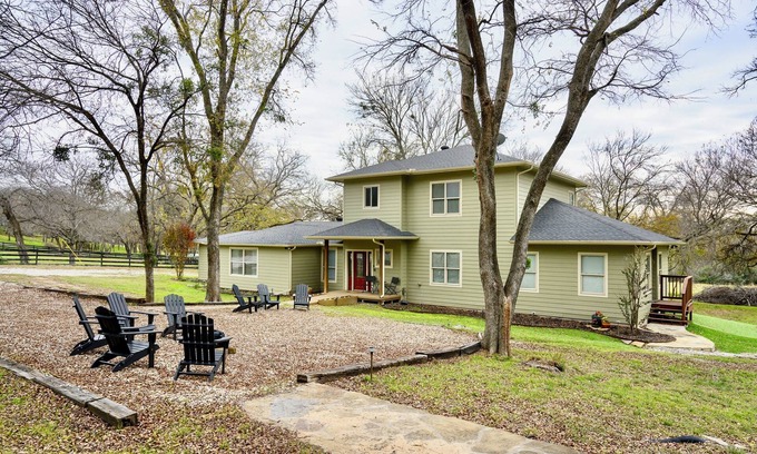 The Clear View Retreat: Your Denton/Aubrey area Home Away from Home is ideal for those looking for a short-term rental in a quiet and scenic location. This property offers unique and restorative outdoor experiences with adirondack seating, a firepit, and countryside views. You can also take in the outdoors from inside within the large dining room providing you a clear view to the property. Luxury sleeping accommodations for up to 16 people if sharing a room and up to 12 people if in individual beds. The living room can seat up to 12 people comfortably and the dining has seating for up to 14 people. Additional kitchenette seats 6 and cinema/game room offers seating for up to 8, including bean bag seating.
