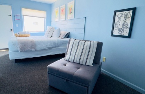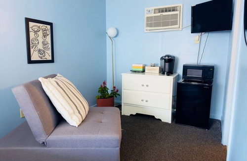 Our cocktail-themed guest room comfortably fits 3 guests and features amenities like a mini fridge, microwave, cable TV, Wi-Fi, and a refreshed bathroom area