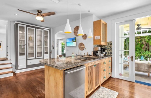 Perfect for added privacy, the newly renovated and designer-furnished detached guest house offers a stylish and serene retreat just steps from the main home. Inside, you'll find a comfortable queen bed, smart TV, new split-unit AC, and a kitchenette equipped with a stove, oven, and essentials for light cooking. French doors provide views of the pool deck and open to a peaceful patio area with a small bistro set, ideal for morning coffee or evening wine. A full private bathroom completes this charming space—perfect for in-laws, visiting friends, or a romantic couple’s getaway.