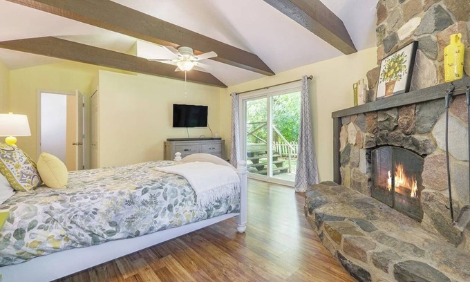 The stunning master bedroom features a vaulted ceiling, a luxurious mattress, and a decorative fireplace (not for use). A sliding door opens out to a fully fenced backyard, offering a private outdoor oasis. Enjoy relaxing on the beautiful back deck