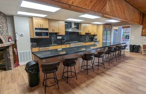 This house is one of a kind. Nestled in the woods of the catskill mountains on a 20 acre gated estate is the Malon Villas Compound. This property makes for the ultimate house to host your large family reunions, corporate retreats, dream catskills wedding, or just an amazing getaway experience for your family and friends. This property is set a few blocks from Sacket Lake public dock and Starlight Marina where you can rent a pontoon, speedboat or wave runner. When you arrive through the gated entrance you will be immediately speechless to the idea that you now have your own hotel for the weekend. We designed this home with the thought of creating the ultimate vacation home getaway experience. This home is a whopping 17000 square feet with 13 bedrooms,12 of which have a full ensuite full bathrooms, as well as a large children's room with bunk beds that sleep 14. The house has a total of 17 bathrooms. There are multiple lounge spaces all throughout the home that make for the perfect setting where many groups can hang out simultaneously. There are two fire places, as well as an out door fire pit. The kitchen is spacious and filled with counter space, a large island with bar and stainless steel appliances, along with a wood burning pizza oven. This house is perfect for bringing along a private chef for preparing large meals. Off of the kitchen and dinning room area is a our large ball room and event space where you can host a large gatherings, which leads to the outdoor deck and patio. The indoor pool area is a show stopper. This area contains a commercial size pool, 15' wood paneled ceilings, a mezzanine overlooking the pool, lounge areas, DJ booth and full tiki bar. Walking out of the pool area leads you right into our game room. This room has a pool table, ping-pong table, gaming table, lounge area, foosball, arcade games and more. Off of the game room is our media room with an HD projector and tons of space for everyone to view and enjoy the show. Next to the media room we have a state of the art fitness center for you to get your burn on or just a relaxing yoga flow. The rear great lawn is multiple football fields wide that would make the perfect outdoor wedding venue, or just endless space for the kids to run free. The outdoor patio has lounge seating, a fire pit, barrel sauna and a 10 person hot tub. This house is just a 15 minute ride to Woodstock/Bethel Woods, and just minutes from boating and hiking trails. It has everything the Catskill mountains has to offer! We look forward to hosting your unforgettable getaway weekend soon!