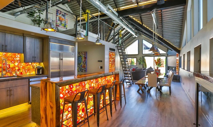Eat your heart out on the Condo's stunning kitchen boasting backlit agate, a custom live edge wood bar, and a stunning wood slab dining table.