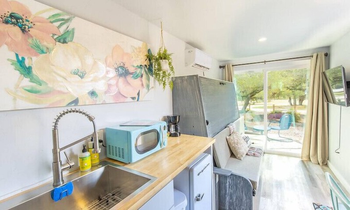 Our mattresses were custom handmade locally from Cantwell Mattress in San Antonio. Our shampoo, conditioner and body wash are made with 100% Pure Morocco Argan Oil and are 100% Vegan & Cruelty-Free. In addition, our hand soap is made with essential oils, aloe vera, olive oil, and without parabens, phthalates, or artificial colors. We have provided everything you need in our kitchenette, including a corkscrew and wine pourer to enjoy your Texas Hill Country wine.