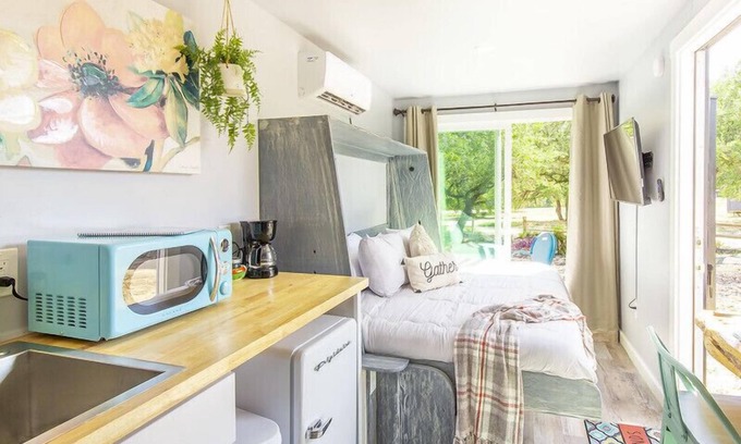 Our mattresses were custom handmade locally from Cantwell Mattress in San Antonio. Our shampoo, conditioner and body wash are made with 100% Pure Morocco Argan Oil and are 100% Vegan & Cruelty-Free. In addition, our hand soap is made with essential oils, aloe vera, olive oil, and without parabens, phthalates, or artificial colors. We have provided everything you need in our kitchenette, including a corkscrew and wine pourer to enjoy your Texas Hill Country wine.