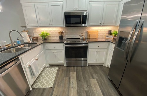 -Inviting Kitchen: Enjoy cooking in a fully-stocked bright white kitchen perfect for preparing your favorite meals. The kitchen includes a coffee station with a keurig machine with pod or full pot option. Also included are refrigerator with built in ice maker and water dispenser and some pantry essentials you may need during your stay.