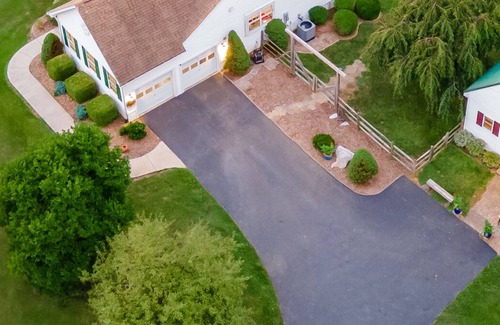 The Cottage is comprised of the Loft (King & Two TwinXLs), Full Bedroom downstairs, a living area with sofabed and TV, kitchenette, and bathroom with separate shower room and toilet room. Use of the backyard - firepit, picnic table, and grill. The cottage sits on our 3-acre property at the end of the road. Our private home and toy barn are also on the property.