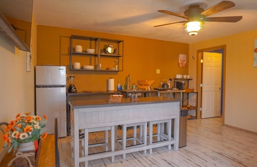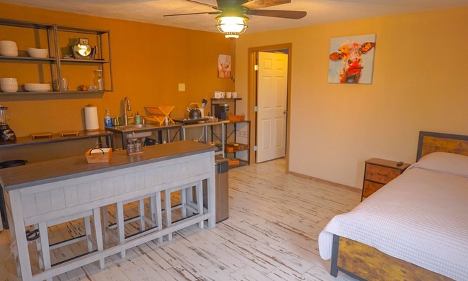 Welcome to The Countryside Studio, an industrial-rustic style studio unit set over three sprawling acres on the outskirts of San Antonio. Enjoy waking up each morning to the roosters crow and a fresh brewed coffee while taking in the countryside views the home has to offer. Upon entering you will notice the rustic style flooring and decor while adding in a touch of industrial vibe. The Countryside Studio will tempt you to turn your weekend getaway into a long term stay.