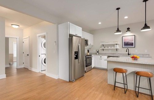 The Cove offers two-bedroom, two-bath units, each thoughtfully appointed with quality finishes, open concept living space, full kitchens, an in-home washer and dryer, fire pits, gas grills and more. The cottage includes a master bedroom with king-sized bed and en suite. The second bedroom includes two full XL beds and an adjacent full-size bathroom. You’ll also find surprising extras, including your own pontoon boat for the length of your stay, as well as exclusive access to a heated pool and playground.