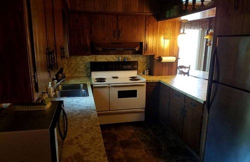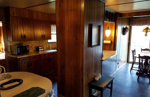 Fully furnished cabin, linens provided. Kitchen outfitted with pots, pans, dishes, and cutlery. Has coffee maker, microwave, blender, toaster, etc. Living room has Satellite TV and DVD player. Full HVAC system for heat and AC. Cabin has covered front porch and a side patio. Charcoal grill at each cabin. Multiple firepits on property. Located 30 seconds from Lake. Ample boat parking outside cabin.