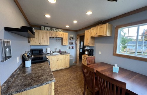 Main floor: Large deck with picnic table and charcoal grill, kitchen with utensils, dinnerware, pots/pans and other kitchen basics. 2 refrigerators/freezers for food and beverages, small dining table, living room w/seating and TV w/Roku and DVD player with an assortment of movie options for a rainy day or quiet night in. Bedroom with a king, bedroom with a queen and a separate bathroom with tub.