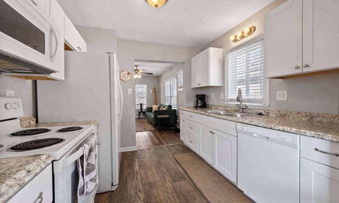 The Cozy Bellows offers comfort and convenience, perfect for a relaxing stay. The spacious backyard features patio seating, ideal for enjoying morning coffee or an evening under the stars. Inside, the kitchen is both functional and inviting, with white cabinets, white appliances, stone countertops, and ample space for preparing a delectable meal. Enjoy your meal at the dining table for two or grab a spot on the living room sofa and stream your favorite show on the smart TV. The bedrooms are designed for restful nights, featuring room-darkening shades to ensure uninterrupted sleep. Whether you're visiting for business or leisure, this home provides a welcoming retreat.