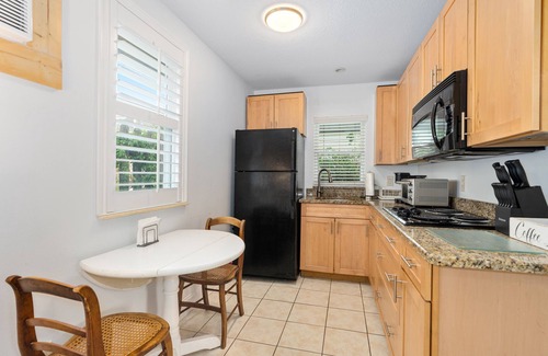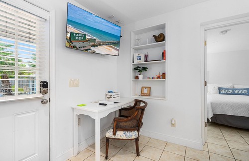 This rental is one half of The CrabTrap Manor and can be booked on its own or together with the adjoining unit as a full-property rental accommodating up to eight guests. With ample space to gather and private corners to retreat, The CrabTrap Manor is perfect for multi-generational family vacations or group getaways. Enjoy time together in the shared community areas—like the game room and outdoor seating area — then unwind in the comfort and privacy of your unit for a little solo recharge time. Contact Distinctive Beach Rentals to reserve the entire manor or just this charming one-bedroom bungalow for your next coastal escape.