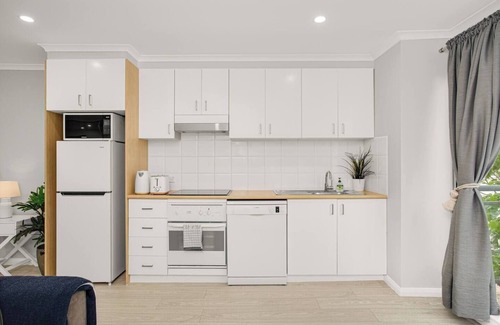 Sleep easy in a comfortable queen-sized bed. It comes topped with fresh white linens and has side tables with reading lights. There are large built-in wardrobes for hanging your belongings and air-conditioning throughout to keep you cool. The bathroom is immaculately presented with a combination bathtub and shower and toiletries provided for your stay. Guests will also have access to private laundry facilities including a washing machine and dryer.