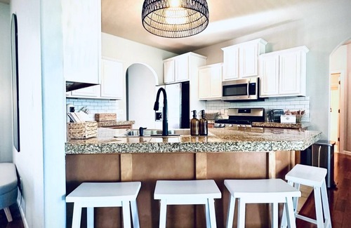 Enjoy all new ergonomic furnishings, memory foam mattresses, large jetted spa tub, stainless steel appliances, connected kitchen/ dining/ living room, upstairs suite with kids playroom, covered deck, private heated pool, outdoor fire pit with a play area with swings for all ages.