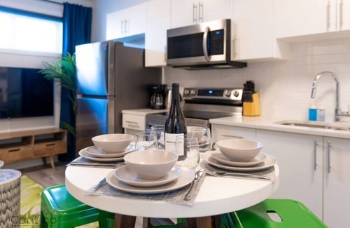 ✦ Complementary WiFi, tea and coffee. The kitchen comes fully loaded with brand new stainless steel appliances such as a microwave, fridge, electric stove and dishwasher along with glasses, mugs, dishes, cutlery, and more!