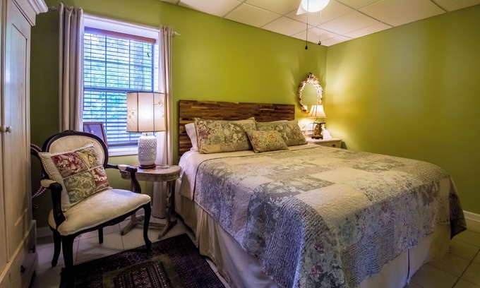 The Dock Suite at Smith Lake B&B provides a luxury hotel alternative for your Alabama vacation getaway. This guest accommodation has a beautiful private covered porch and feels cozy. The suite contains a king-size bed in the bedroom with a sleeper sofa and a daybed in the den. It has a private bath and a kitchen/breakfast room. The kitchen is equipped with a full-size refrigerator, stove, microwave, Keurig coffee maker, dishwasher, dishes, pots and pans. The den has a fireplace and satellite TV with DVD player. Entrance is from a private covered porch overlooking the gazebo and boat dock.
