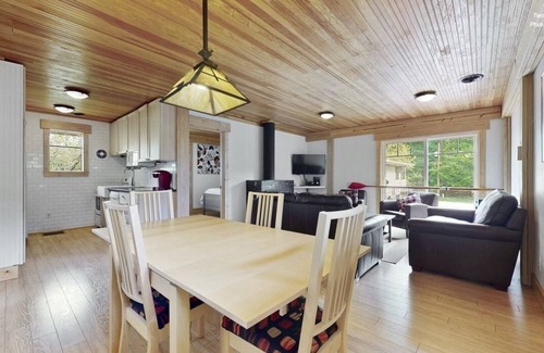 The Main house has a dining table with seating for 14 and a large living room which make sure that no one will be left out when gathered around the fire place. The sun porch, library and small office offer more intimate spaces. The fire pit with free wood, outdoor dining area and the private patios all offer great spaces on warm summer nights. This is our family vacation home. New yet warm. Everything was new in 2014. The building has been completely rebuilt with quality materials by a Architect/Builder. The furnishings were specifically selected for the house. The wood ceilings, floors and trim make the house warm. Craftsman style mosaic work, original art and creative details add character and charm.