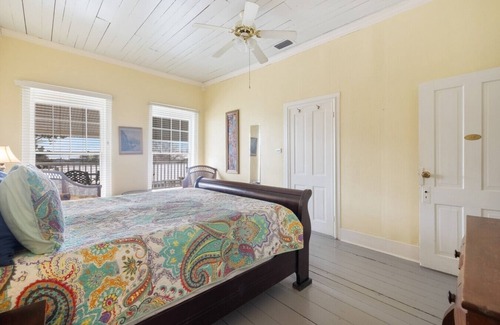 Room 34 is a spacious and elegant corner suite at the Island Hotel, offering a perfect blend of vintage charm and modern comfort. This large king room features a clawfoot tub with a shower, adding a touch of historic character to the ensuite bathroom. The northeast- and southeast-facing windows provide views of the patio area below along with glimpses of the Gulf, allowing natural light and coastal breezes to fill the space. With its grand feel and timeless charm, Room 34 offers a relaxing and memorable stay in the heart of Cedar Key.
