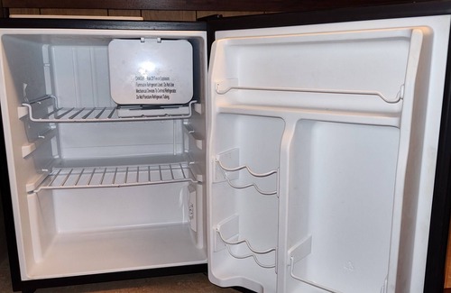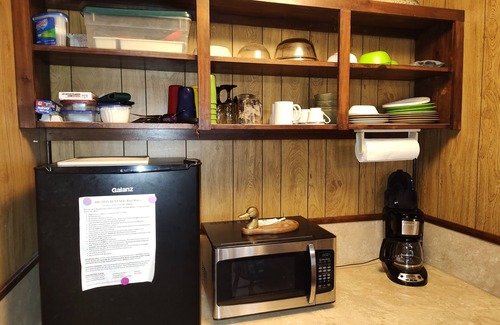 Cabin # 6 is a one room cabin with two twin beds. The bathroom has a walk-in shower. The kitchenette contains a mini fridge, microwave, coffee maker, double sinks, dishes, glasses, coffee mugs, utensils and a table and chairs for 2. There is no stove so no cooking indoors, please. There is a store/cafe within walking distance.