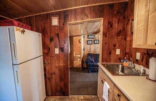 Accessible from the kitchenette, the private deck features a propane grill and table with chairs overlooking the river. A picnic table is also situated between Cabins 12 and 14, making it a convenient spot for larger gatherings or socializing with neighbors.