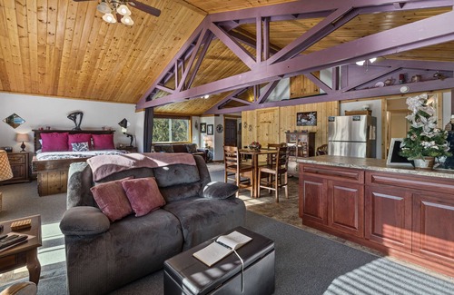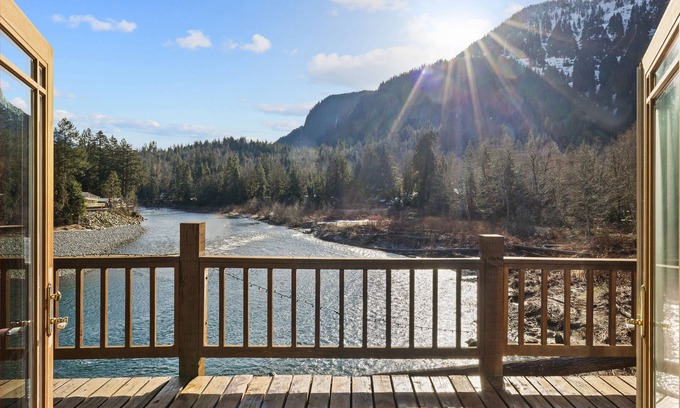 Climb up to soaring ceilings, gorgeous surroundings, and amazing views. The Eagles Perch makes you feel like you're up in the trees looking out over the river coming right at you, and the Cascades in the far distance and Mt Index, soaring majestically over you. This 700 sq ft. spacious studio is perfect for a romantic getaway. The Eagles Perch offers all the creature comforts of home. full Kitchen, full bathroom, propane fireplace, washer/dryer, King Size High Bed, Queen leather sleeper sofa, and loveseat, TV, WIFI, large deck with propane BBQ, Adirondack chairs and ottomans. *Note: there is a downstairs apartment that can be rented for larger groups, check out our "South Fork Lodge" to rent both floors. Otherwise, the downstairs apartment may be rented to other guests.